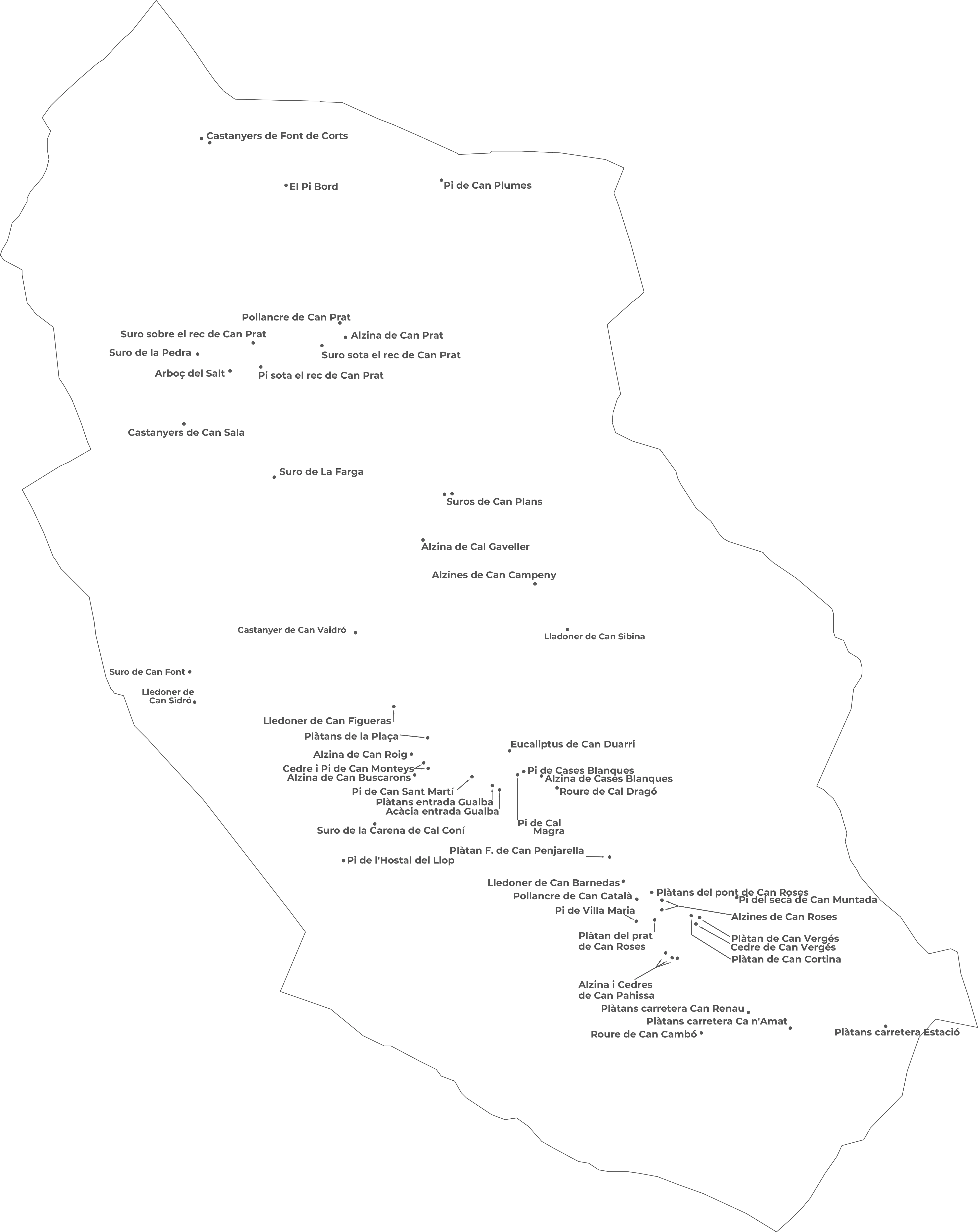 Alguns d'aquests arbres es troben associats a antigues masies i eren utilitzats com a fites o referents del paisatge agrari. D'altres creixen en espais forestals poc alterats on la manca de pertorbacions humanes els ha permès assolir dimensions excepcionals. La seva distribució pel terme reflecteix els espais on la continuïtat forestal ha estat més llarga.