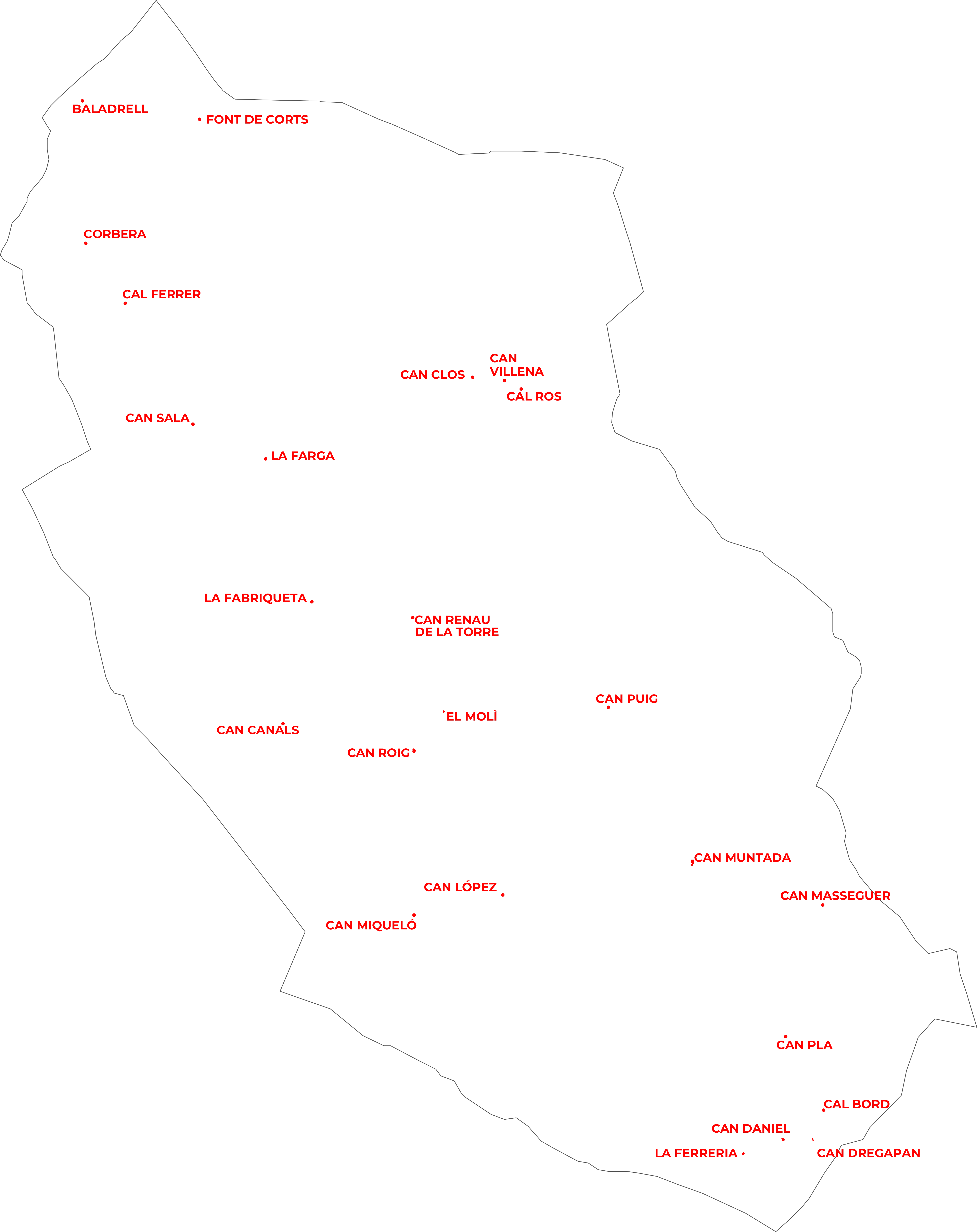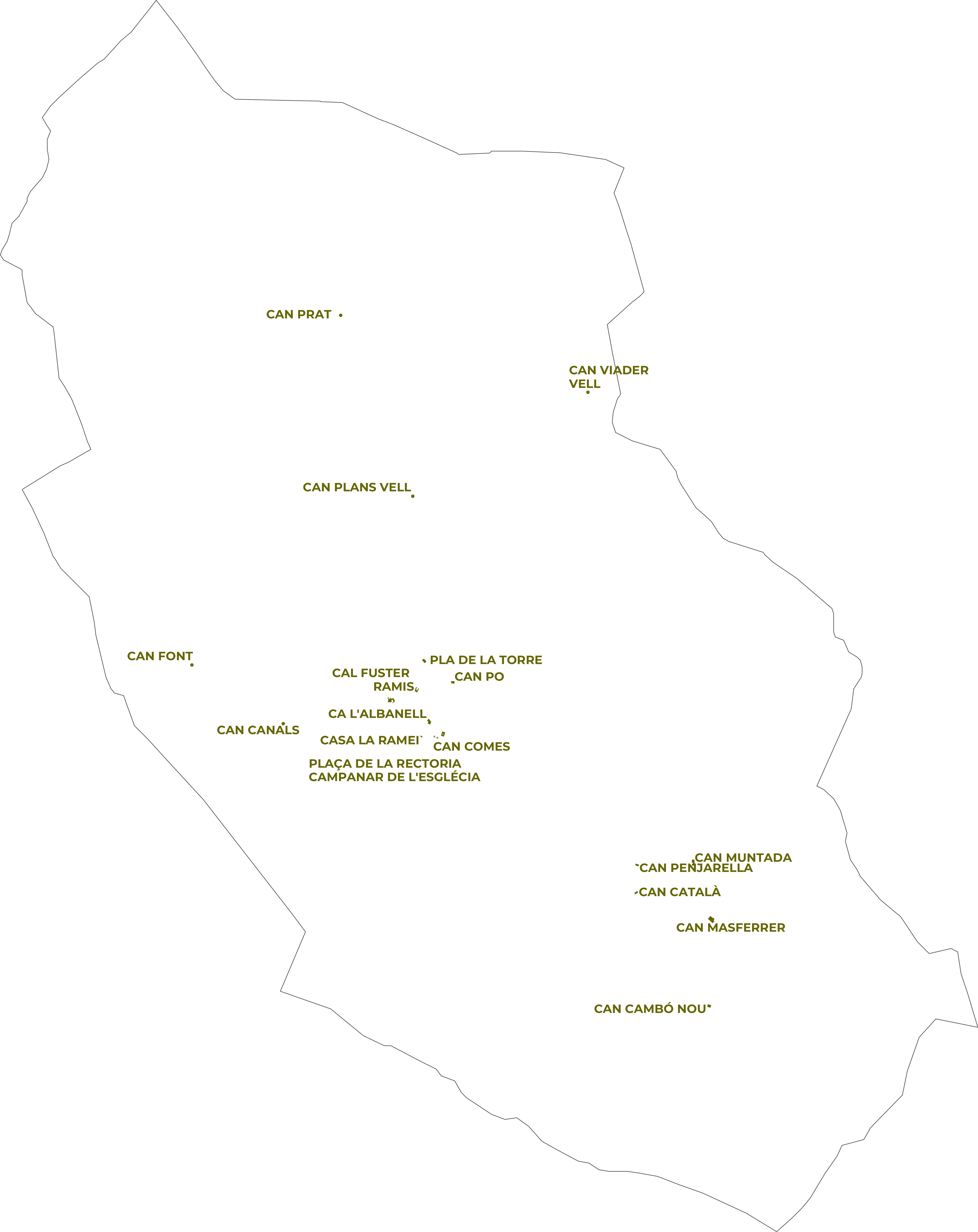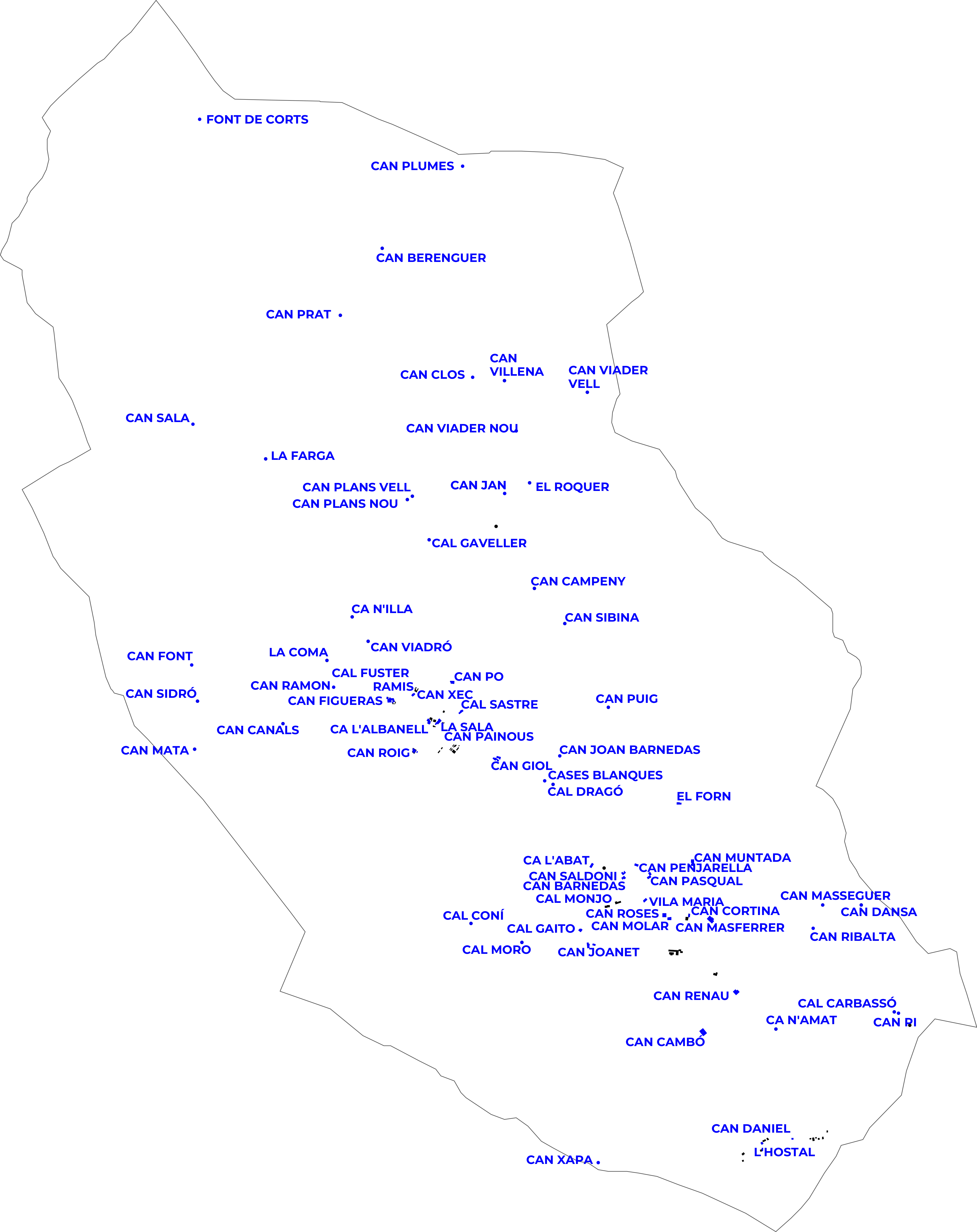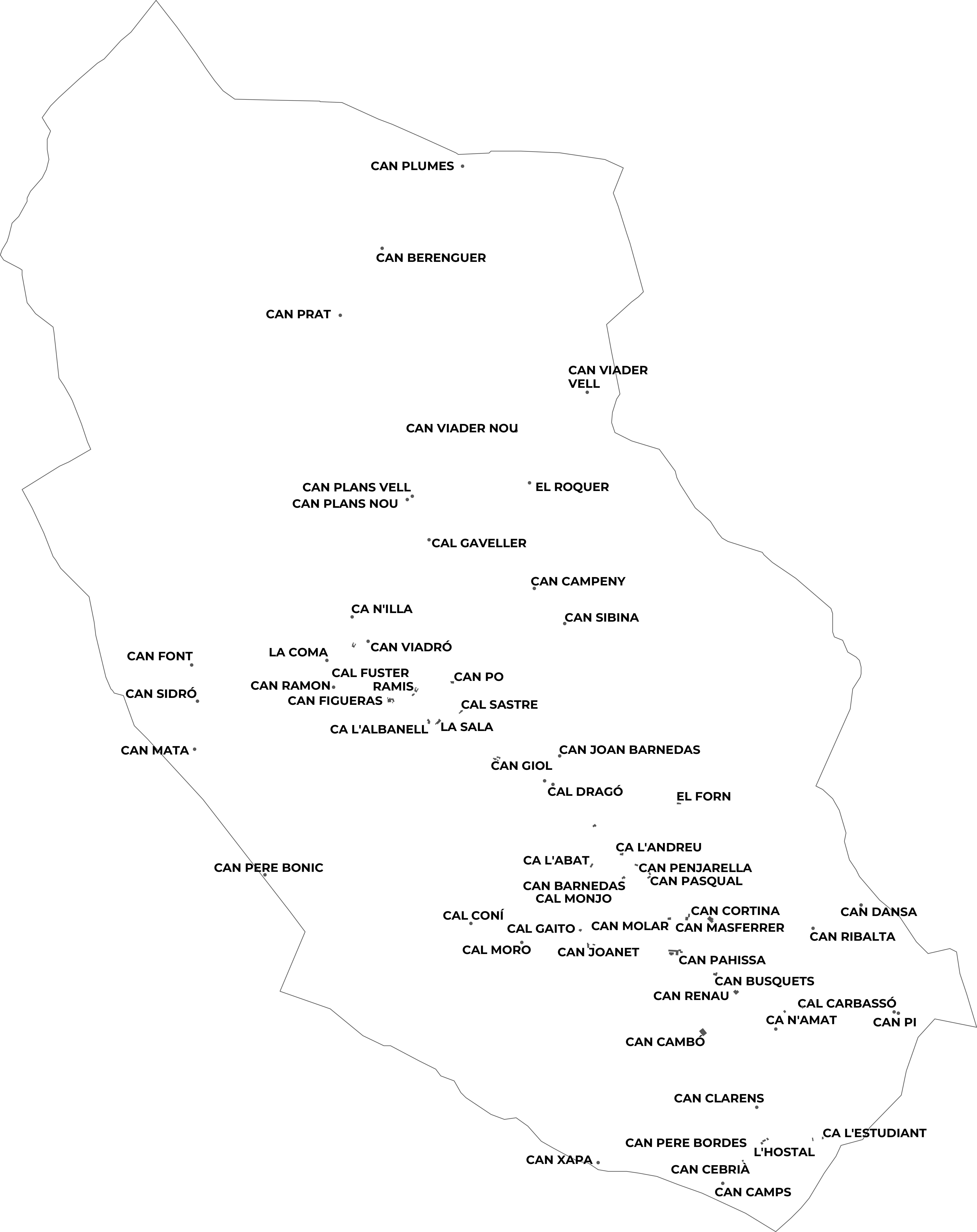 El mapa de cases habitades recull tots els edificis del terme municipal que han tingut o tenen ús residencial permanent. La distribució reflecteix el patró d'assentament tradicional de la zona: un nucli compacte al fons de la vall i un conjunt dispers de masies i cases de pagès escampades per les carenes i els vessants.