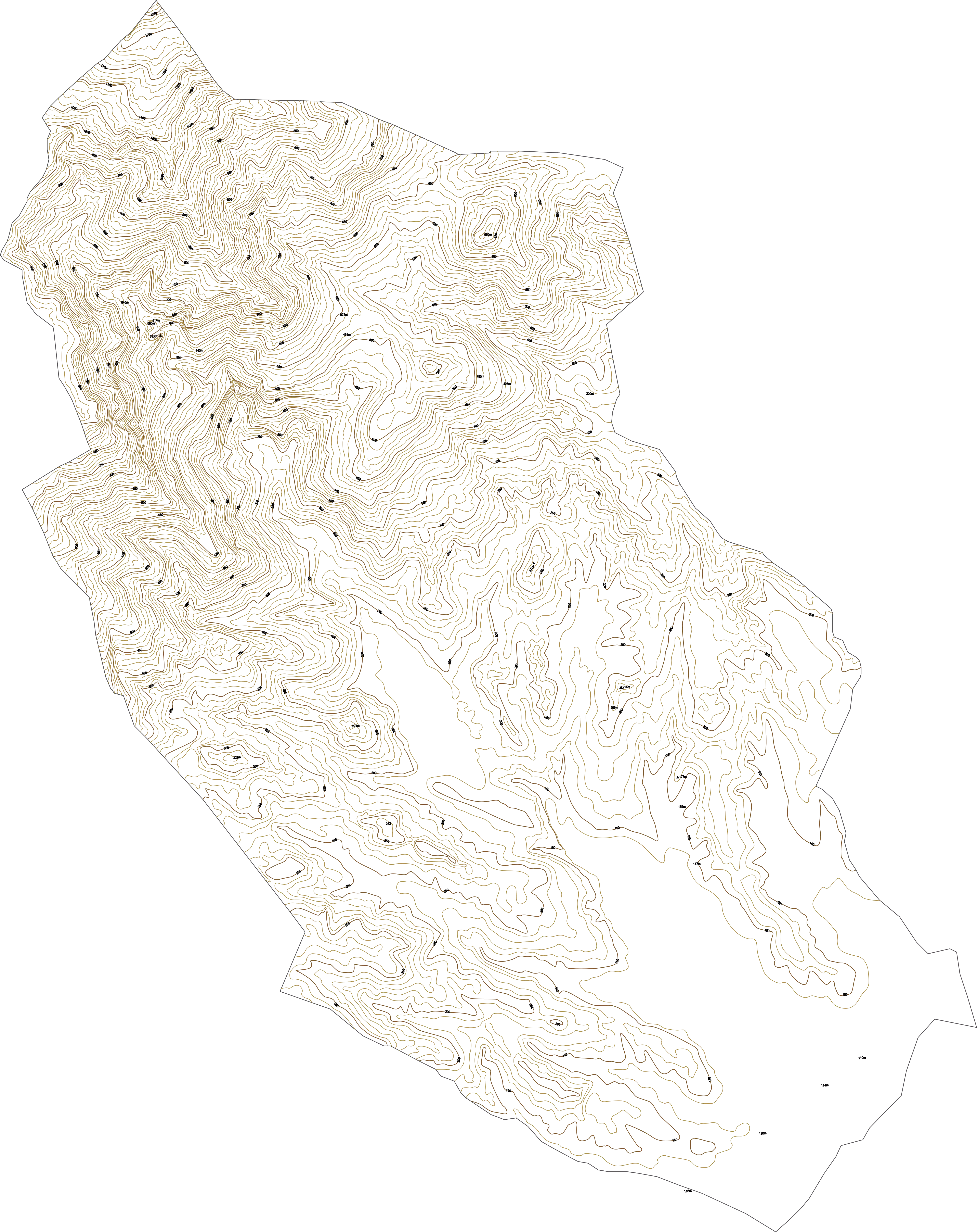 La topografia determina directament els usos del sòl: les zones planes i suaus del fons de vall acullen els conreus i el nucli urbà, mentre que els pendents moderats estan coberts de boscos mixtos i els relleus més abruptes de les carenes superiors queden en estat natural. Les corbes denses a la part alta indiquen la presència de parets rocoses i tarteres.