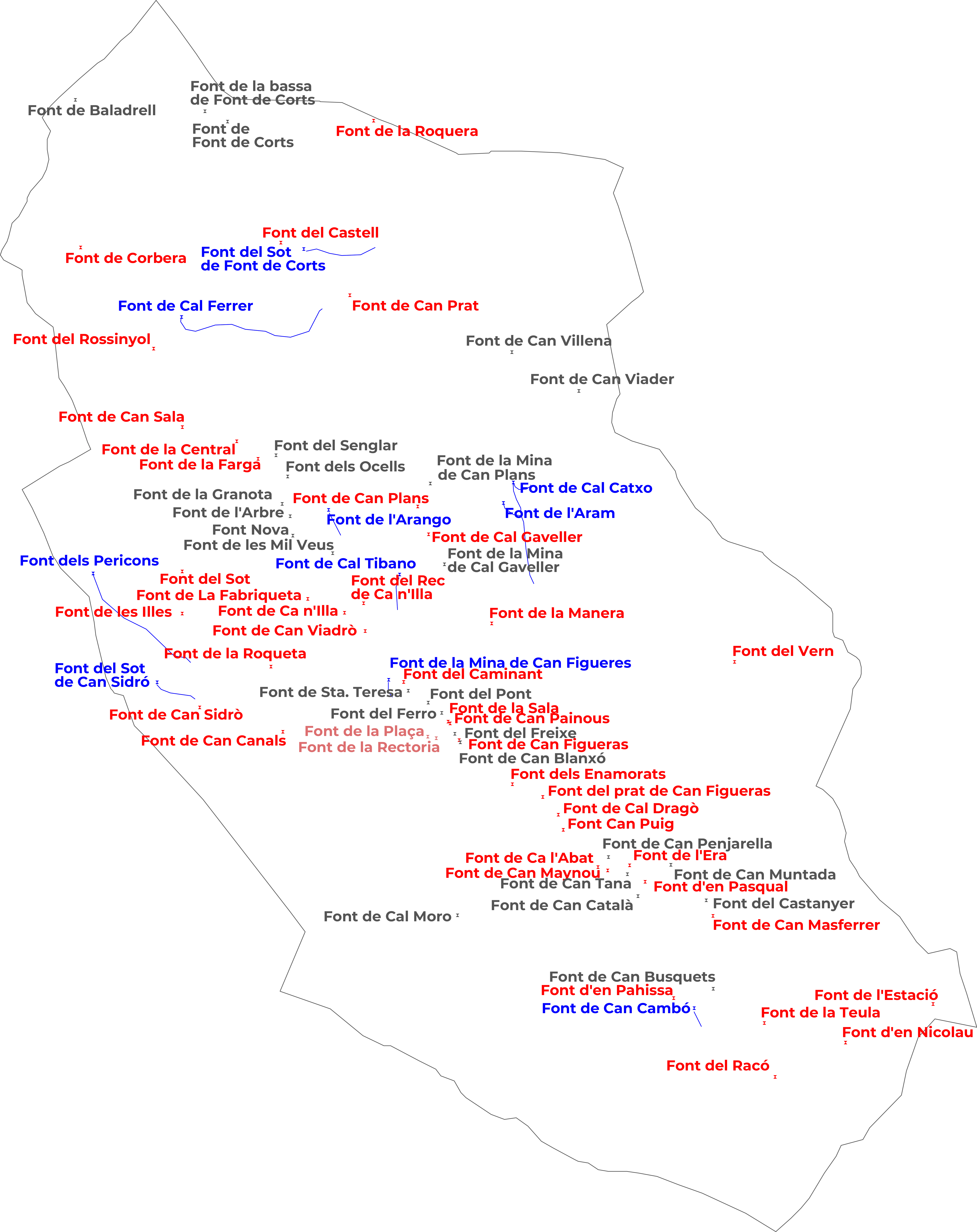 Les fonts actuals són aquelles que en el moment de l'inventari presentaven un raig d'aigua continu o estacional, indicant que el seu aqüífer es troba en bon estat. La seva distribució al mapa revela la riquesa hídrica del terme i serveix com a indicador de la salut dels ecosistemes forestals que retenen i regulen l'aigua de pluja.